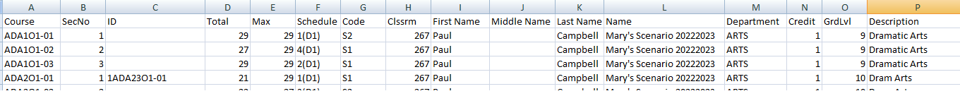 Course, SecNo, ID, Total, Max, Schedule, Schedule Term> Code, Clssrm, Primary Staff> First Name, Primary Staff> Middle Name, Primary Staff> Last Name, Schedule> Name,