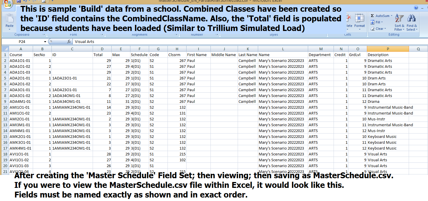 | Total | 'Enrolment Total' | This is the Section Size. During the year, the 'Total' field contains the Section Size. While in 'Build' mode, the 'Total' field contains the most recent Build Section Size (what we used to know as the Trillium 'Simulated Load' number of students.) So in Aspen®, there is no need to create a 'ClassLoad.csv' file and import Master Schedule and ClassLoad etc. Always import only the MasterSchedule.csv | 22 |